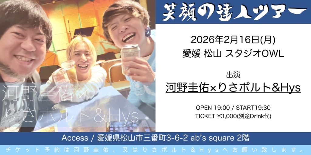 News 1月の参加型イベントのスケジュールを更新しました! 年末年始のイベントをお知らせします! 12月のフリーライブの予定を追加(4(木)、24(水))しました! 12月の参加型イベントのスケジュールを更新しました! Pick Up Live! 直近のイベント(終了時間は目安です※終了を予定している時間ではありません) 1月 29 12:10 – 13:00 KIYOKAランチライブ 1月 29 19:00 – 22:00 フリーライブ 1月 30 19:00 – 23:00 生オケ!フォーク酒場 1月 31 終日 貸切イベント 2月 1 14:00 – 17:00 お昼間フリーライブ 2月 5 19:00 – 22:00 弾キガタリスト大集合!2月号(※ゲストあり) 2月 6 19:00 – 22:00 フリーライブ 2月 7 16:00 – 19:00 夕方フリーライブ カレンダーを表示