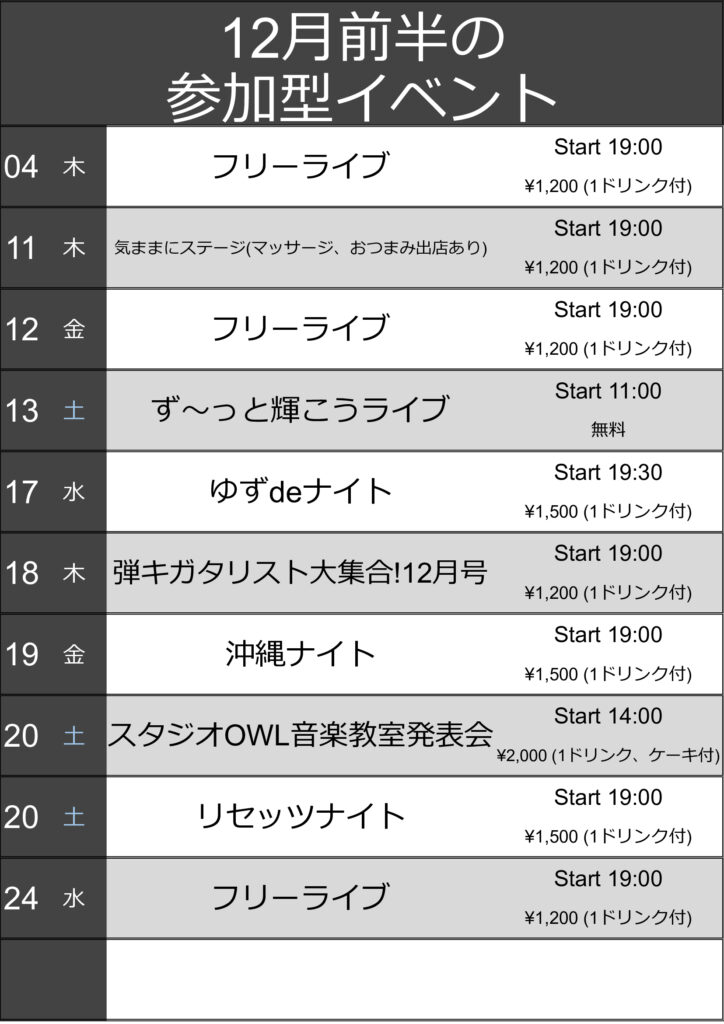 2025年12月3日 / 最終更新日時 : 2025年12月3日 owl21 未分類 12月のフリーライブの予定を追加(4(木)、24(水))しました! 12月のフリーライブが少ないとの声がありましたので12/4(木)、24(水)にもフリーライブを開催いたします!急に寒くなりましたが、早速明日もありますのでご都合会う方は暖かい格好で是非お越しください!