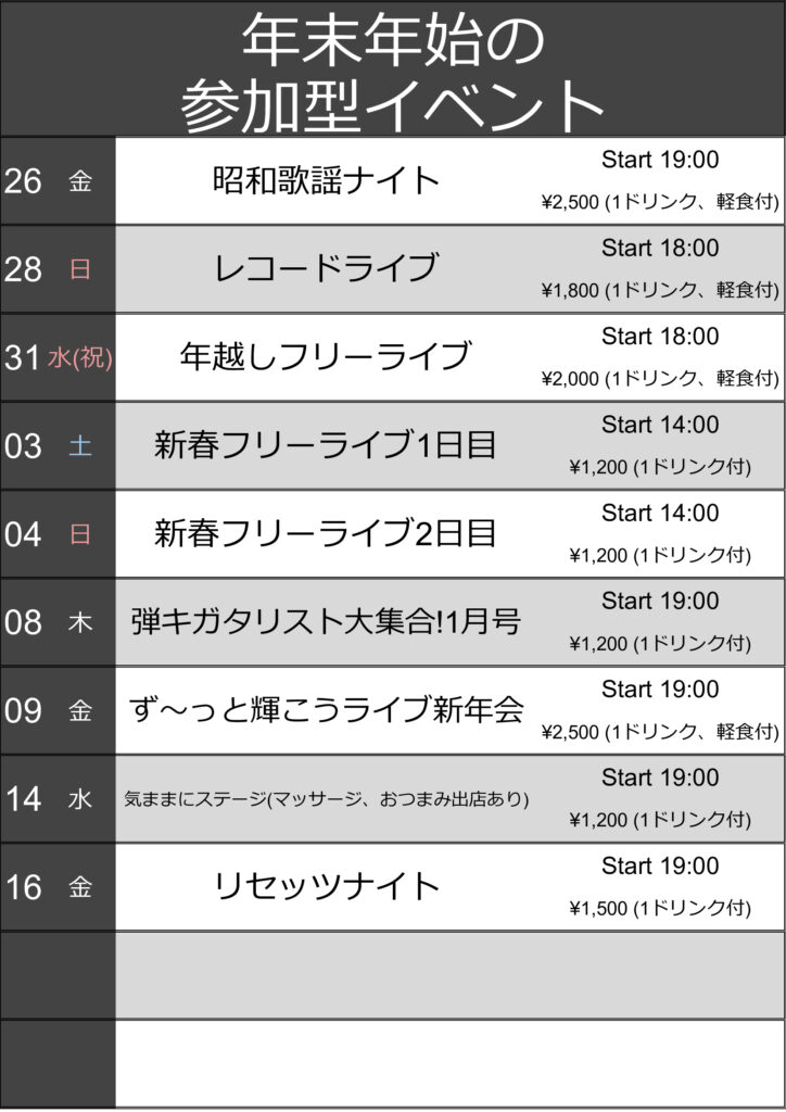 クリスマスイブのフリーライブから始まり、いつもの昭和歌謡ナイト、レコードライブがあります。
