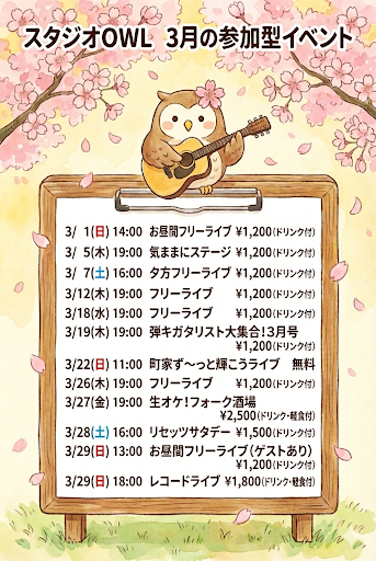 2026年2月27日 / 最終更新日時 : 2026年2月27日 owl21 参加型ライブ情報更新 3月の参加型イベントのスケジュールを更新しました! 3月の参加型イベントのスケジュールを更新しました!ご都合の合う日に是非遊びに来てください!! こちらのイベントも第二部はフリーライブ形式となっておりますので、奮ってお祝いの演奏を聴かせに来てください😄