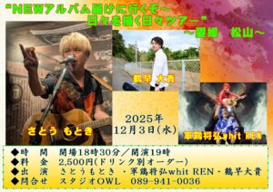 【出演者】さとうもとき、鶴早大貴、軍鶏将弘 with REN 【開催日】2025年12月3日 【開場時間】18:30【開演時間】19:00 【料金】2500円 ※要1日ドリンクオーダー 【ご予約・問い合わせ】スタジオOWL(HP予約,電話番号:089-941-0036,E-mail:studio.owl.contact@gmail.com)